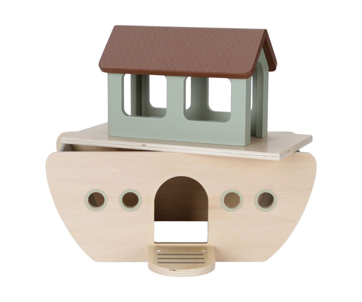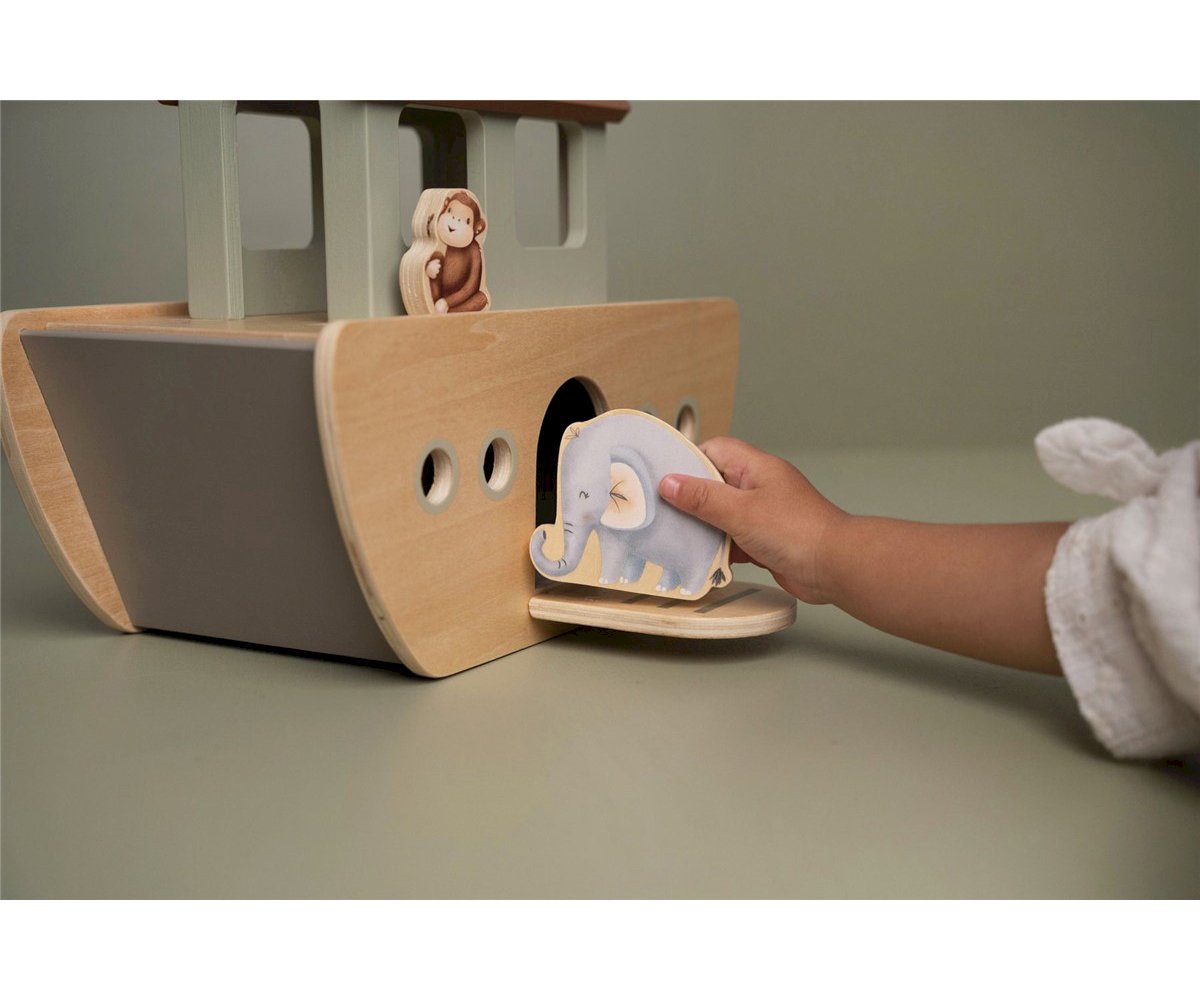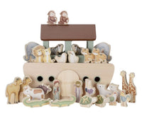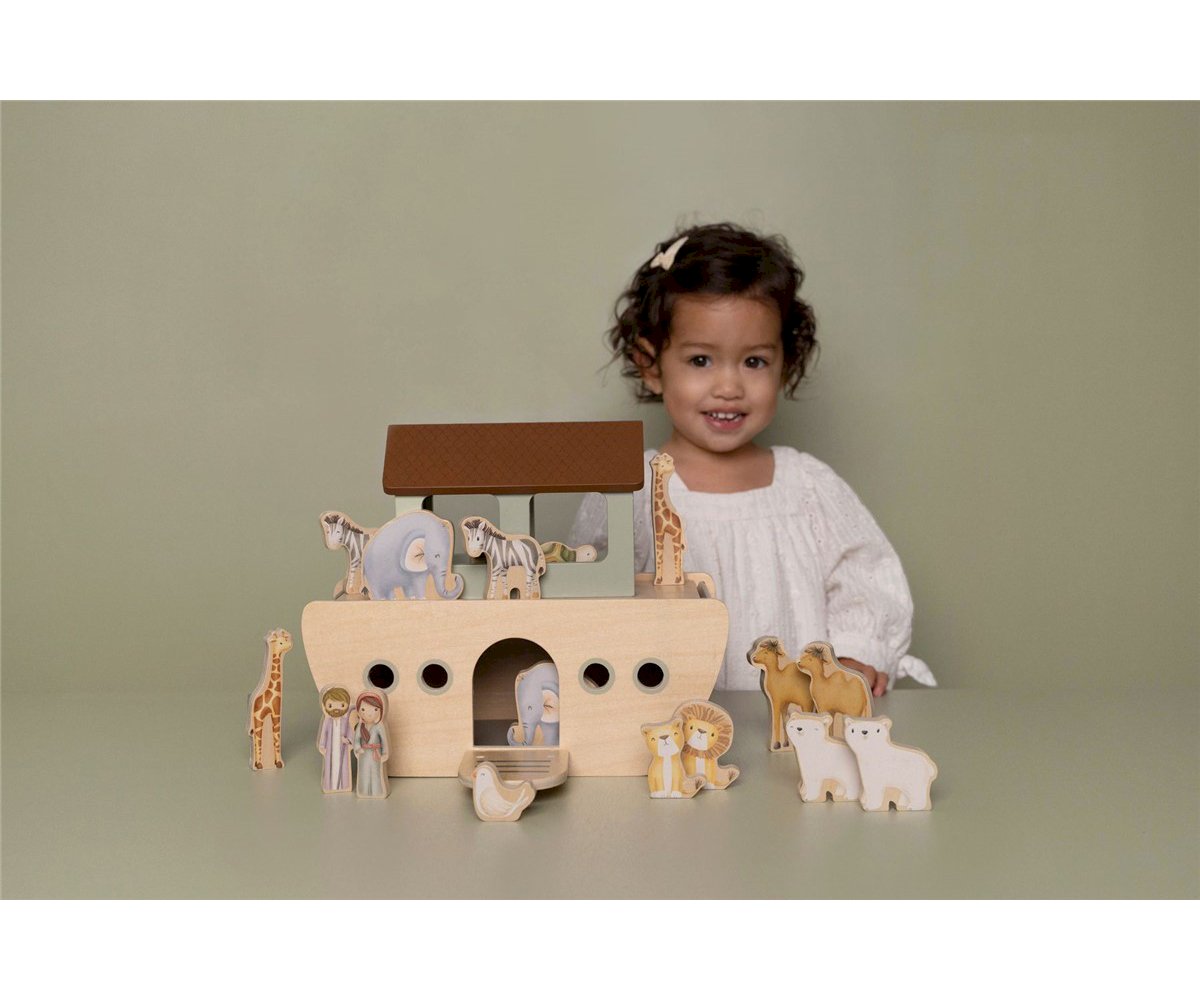 Ayuda a los animales a encontrar a sus parejas y prepáralos para el viaje. Incluye el arca con una puerta y una pasarela desmontable, además de Noé, su esposa y una gran variedad de animales en parejas: palomas, gallina, gallo, tortugas, monos, leones, avestruces, tigres, vacas, toros, osos polares, cocodrilos, jirafas, cebras, elefantes y camellos.