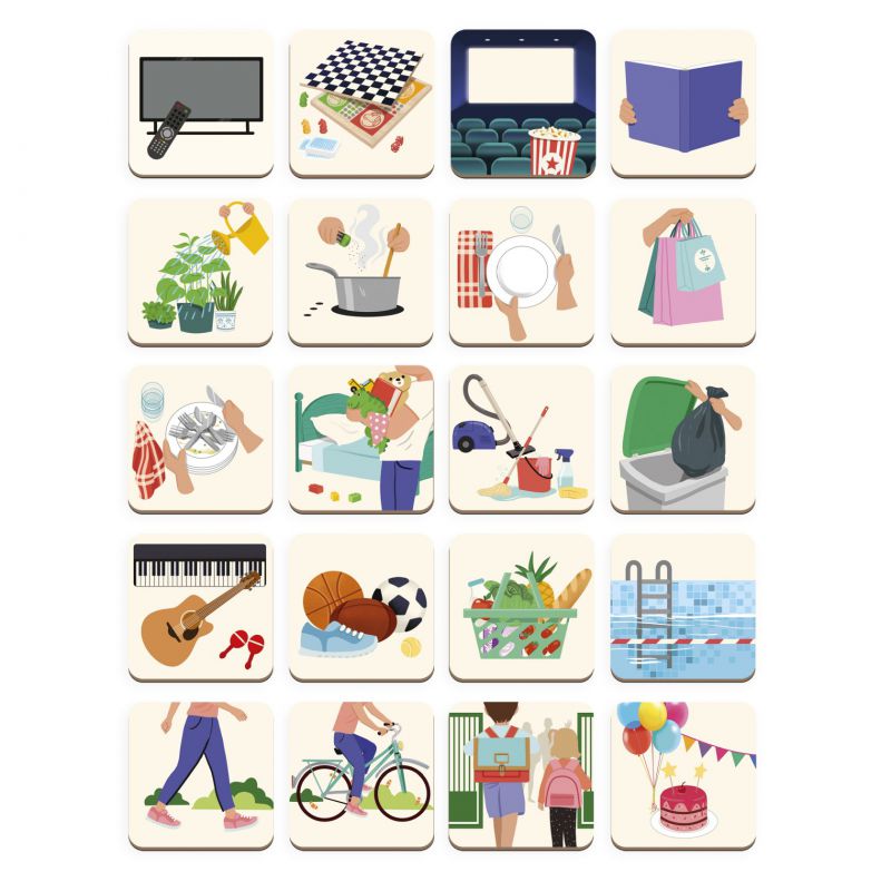 Le permitirá a su hijo orientarse fácilmente en la semana y adquirir autonomía. De esta forma, no olvidará quién le recoge del colegio o qué día tiene deporte. En cada día y cada actividad, su hijo podrá colocar el imán del animal que representa al miembro o los miembros de la familia que participarán en esa actividad. Para ello, el set está compuesto por 5 animales presentes en 11 ejemplares cada uno, 7 pegatinas en 6 idiomas para los días de la semana y 20 imanes de actividades que van desde simples tareas del hogar, hasta el ocio, pasando por el deporte, la música, y los cumpleaños, sin olvidar la salida del colegio. Se incluye un rotulador borrable para escribir el nombre de cada persona en la zona prevista a tal efecto.